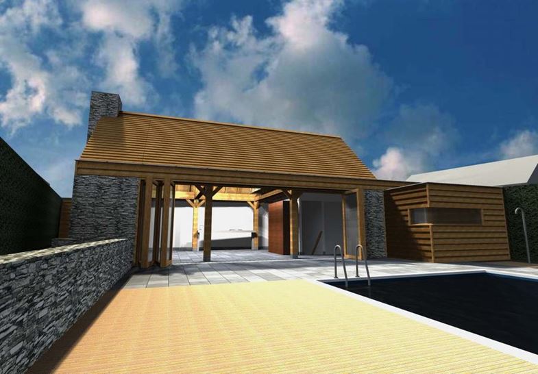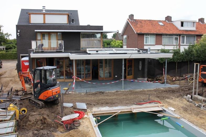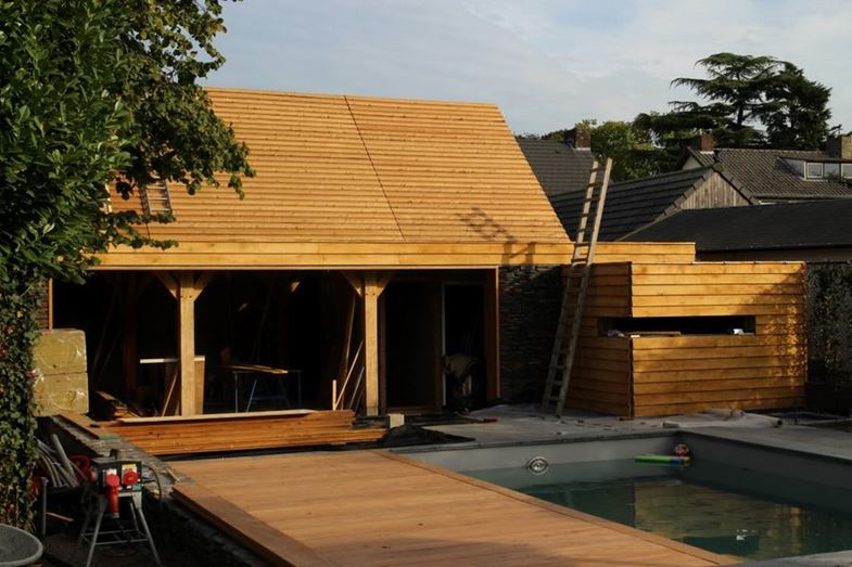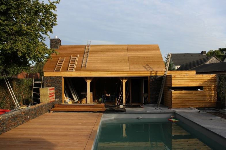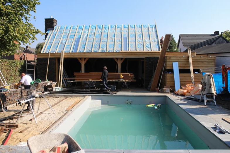Het “Poolhouse” is een ideale ruimte om lekker na te genieten na een heerlijke zwem party. Mocht de temperatuur buiten te fris zijn kan er opgewarmd worden bij de openhaard op de begane grond. Het gebouw is voorzien van een ruime kelder. In deze kelder is geschikt gemaakt tot een royale sportruimte voorzien van diverse gemakken zoals een sauna. Naast het gebruik van hout voor het bouwen van het “Poolhouse” is er gebruik gemaakt van leistenen. Het dak is voorzien van dakpannen welke vervaardigd zijn van traditionele materialen. Aan de woning is het terras voorzien van een mooie grote overkapping. Alles is onder architectuur van Toine v. Balen gebouwd en voor de tuin is gebruik gemaakt van de expertise van Fons Linders Tuinmeester.
